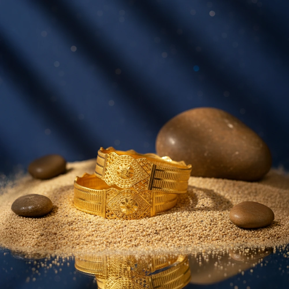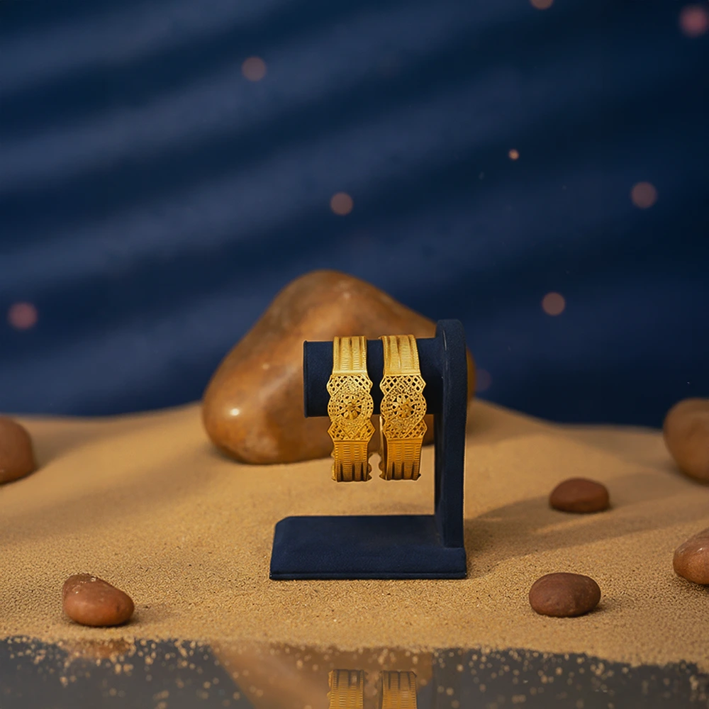 Each bangle in this pair features a sophisticated design, combining smooth, polished gold sections with central broad panels of delicate filigree and finely cut-out patterns. This intricate craftsmanship creates a captivating interplay of light and texture, reminiscent of traditional artistry. The robust yet graceful design allows them to be worn individually for a refined look or as a pair for a more pronounced statement.
