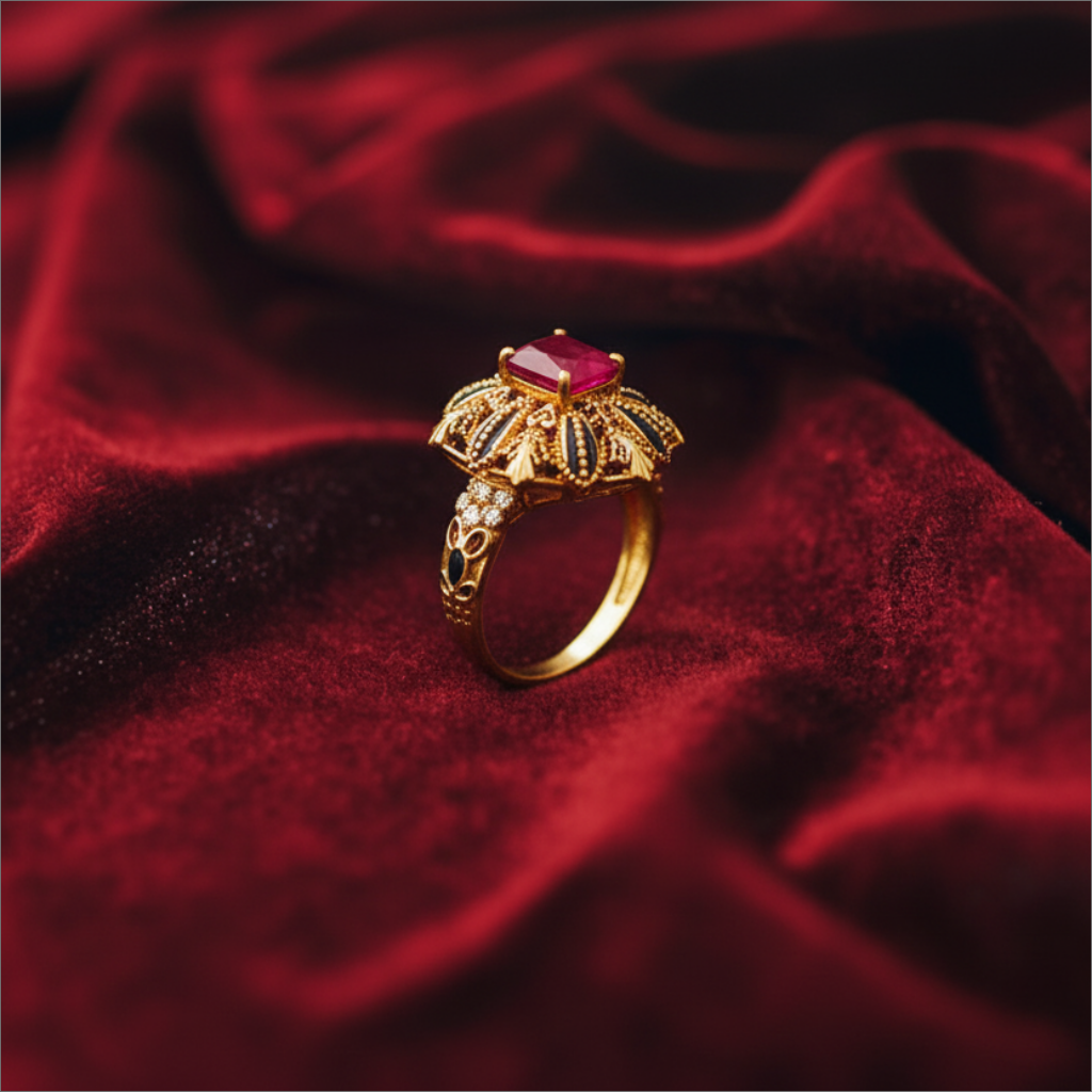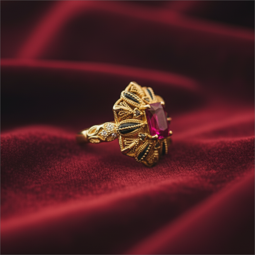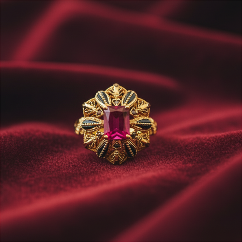 Embodying vintage luxury, The Royal Ruby Enamel Ring is a bold statement piece crafted in approximately 6.50 grams of pure 21-Karat gold.