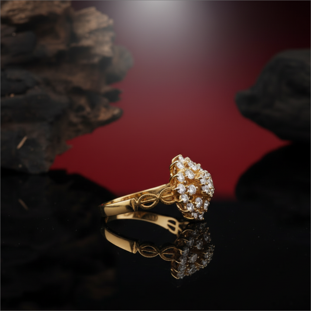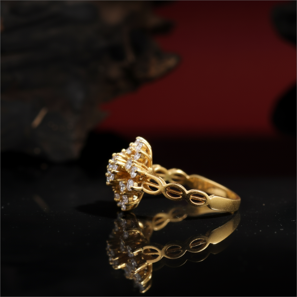 The band features delicate filigree or open-work gold detailing, enhancing the ring’s overall luxurious appeal. The high 21-Karat purity ensures a rich, warm gold colour and lasting value. This piece is perfect for daily elegance, or as a glamorous accessory for parties and special occasions.